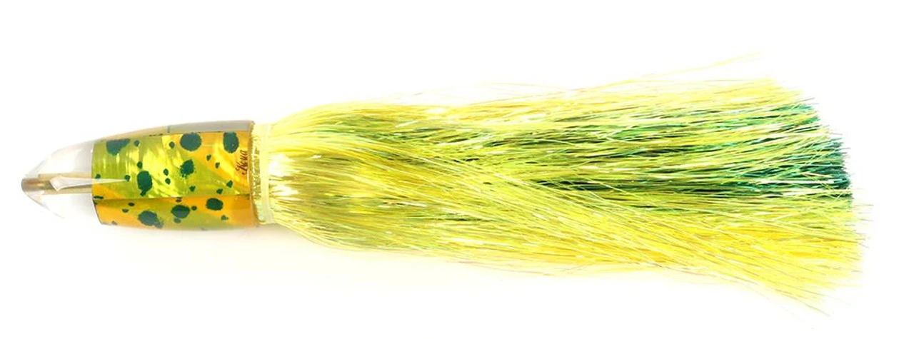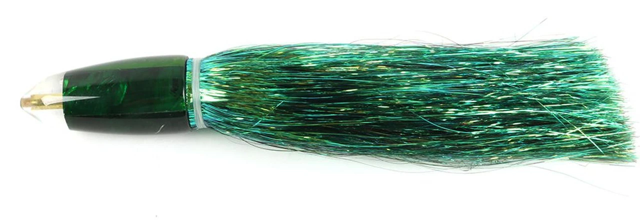Koya Flashabou Bullet Trolling Lures designed and handmade by renowned lure maker Eric Koyanagi are a great all around offshore trolling lure when targeting marlin, tuna, and even wahoo. Available in all of the most productive colors available including green, mahi mahi, white, blue, pink, and purple, and even a fat version with a stubbier head for a more swimming action. Its bullet style head tracks true in all conditions, and its full mylar flashabou skirt puts off a ton of flash to attract big game fish from the deep. The Flashabou Bullet from Koya will be sure to be a productive addition to your offshore big game trolling arsenal.
