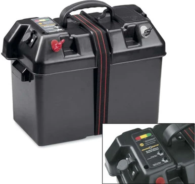 Ideal for small boat, transom applications (boats that do not have battery compartments), this power center features easy-access external battery terminals that allow trolling motor leads and charger leads to be connected without opening the box. A built-in battery meter displays current “state of charge.” Fits group 24- and 27-size batteries.